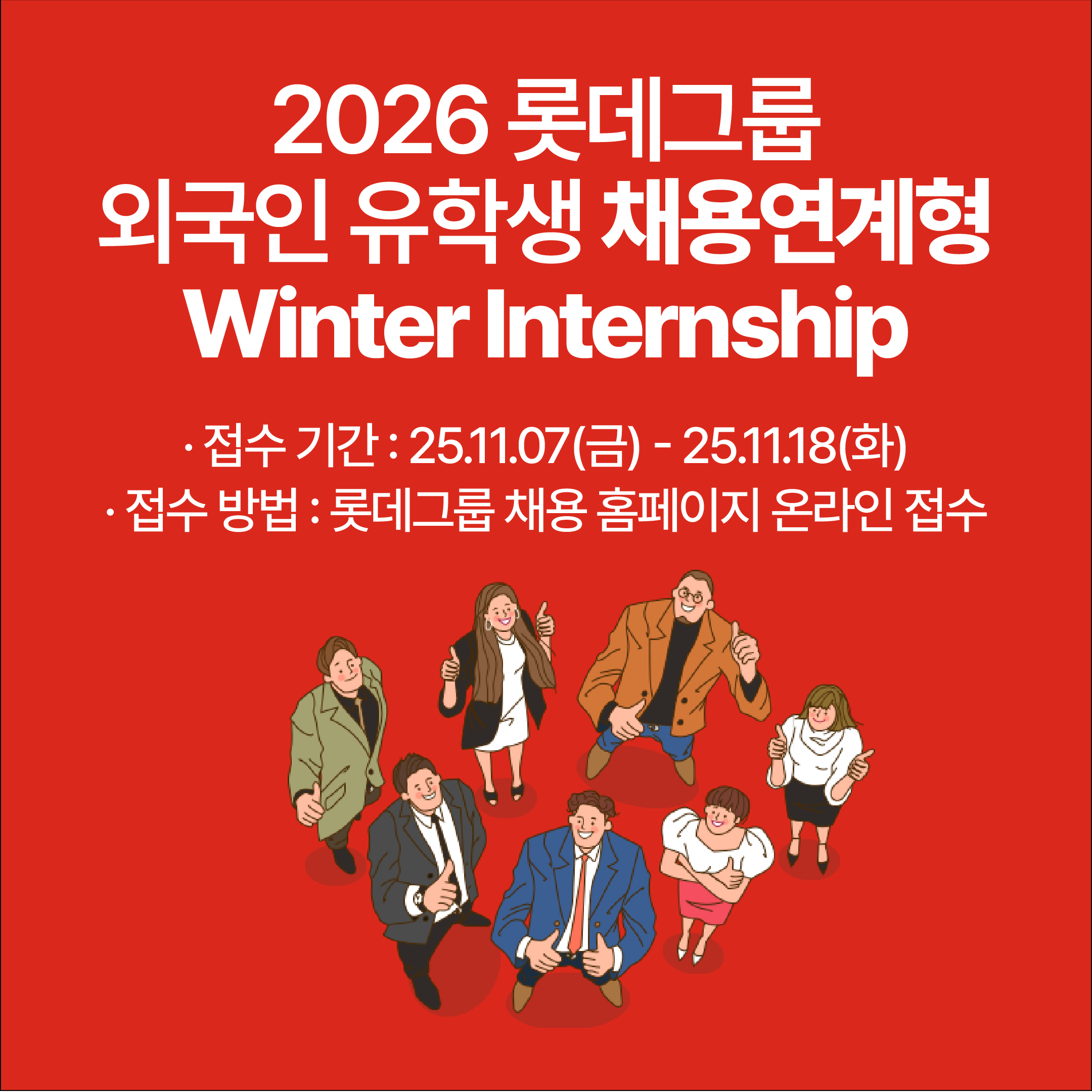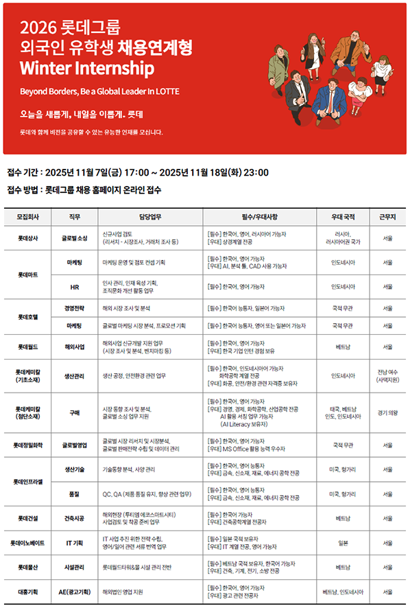 [롯데그룹] 2026 롯데그룹 외국인 유학생 채용연계형 Winter Internship (~11/18)