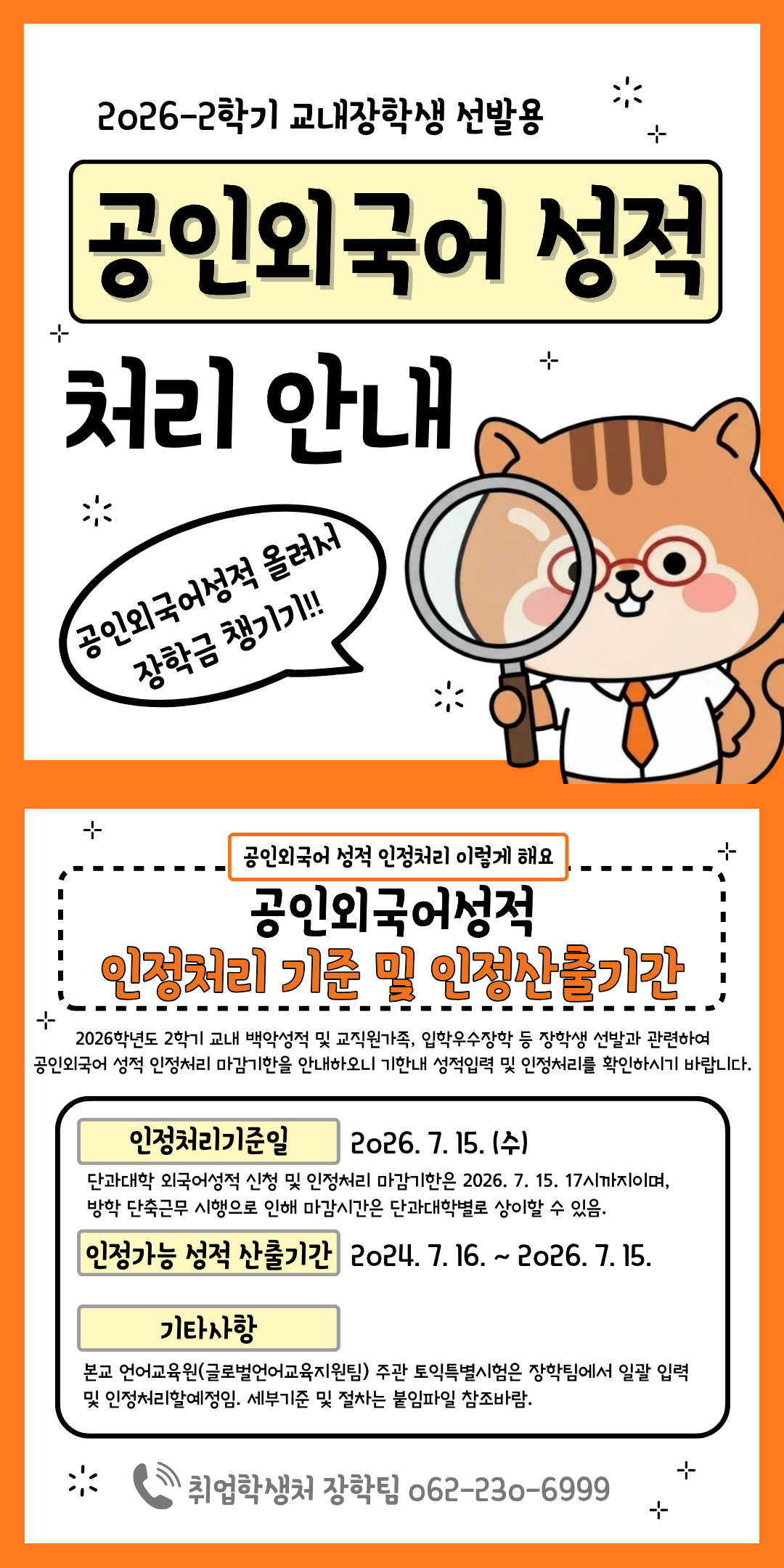 2026-2학기 교내 장학생 선발을 위한 공인외국어성적 처리 안내